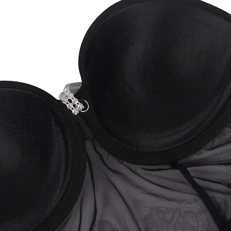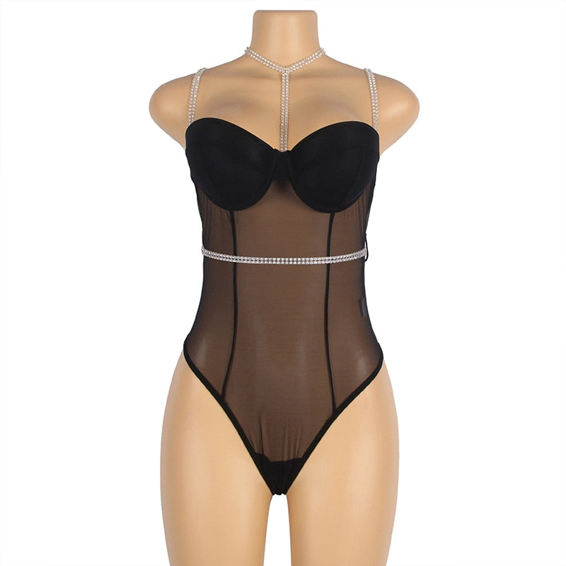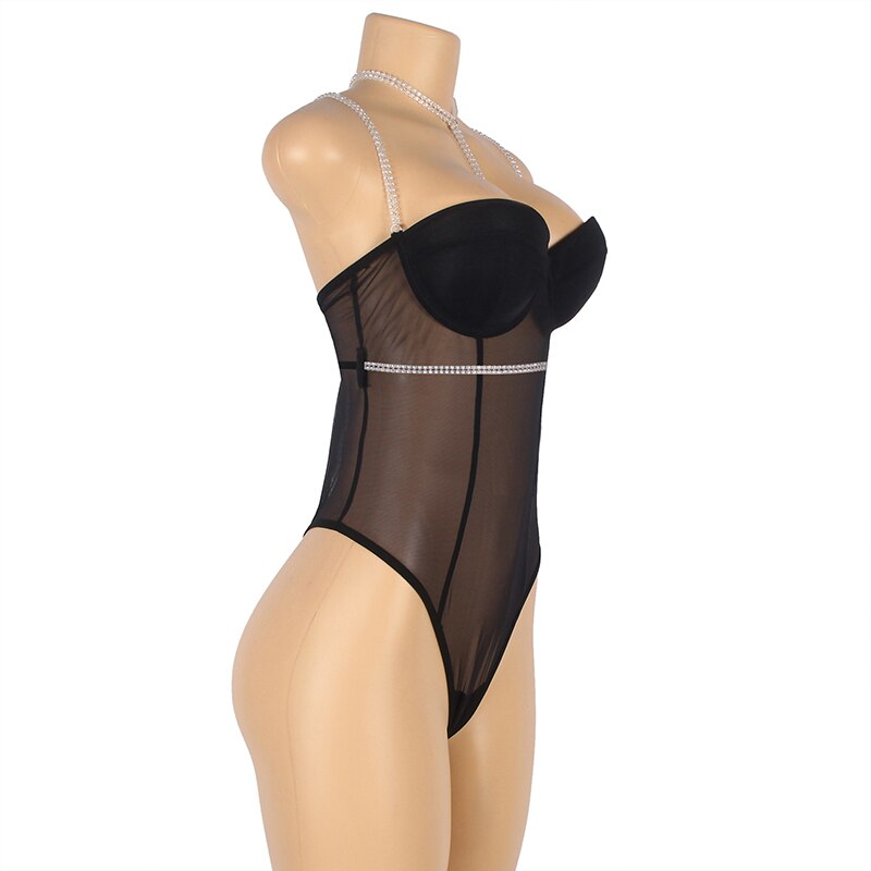 Body extensible et sexy, avec ceinture en dentelle et strass.