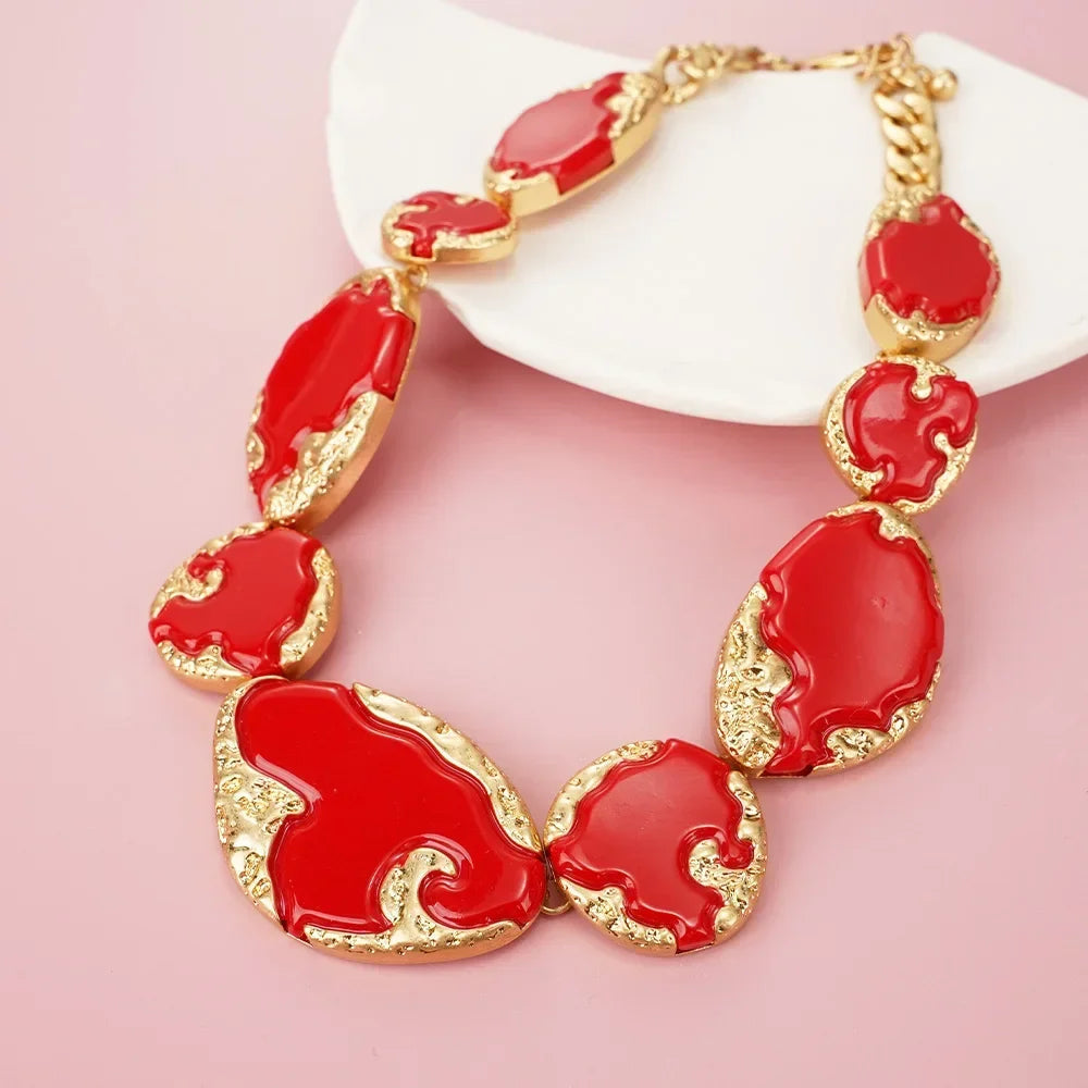 Audacieuse et sophistiquée – cette collier statement est le bijou parfait pour se démarquer avec élégance. Composée de maillons organiquement formés, recouverts d'émail rouge vif et de détails en relief dorés, elle incarne un style artistique et raffiné. Sa structure robuste et son fermoir réglable garantissent un confort optimal et un ajustement parfait. Idéale pour ceux qui recherchent un accessoire remarquable alliant luxe et modernité, pour toutes les occasions.