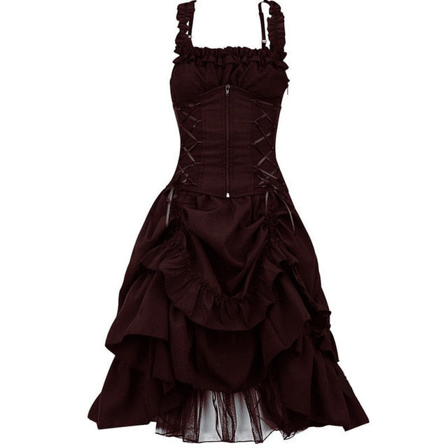 Élégante robe vintage sans manches de style gothique, ornée de bretelles et d'une fermeture zippée.